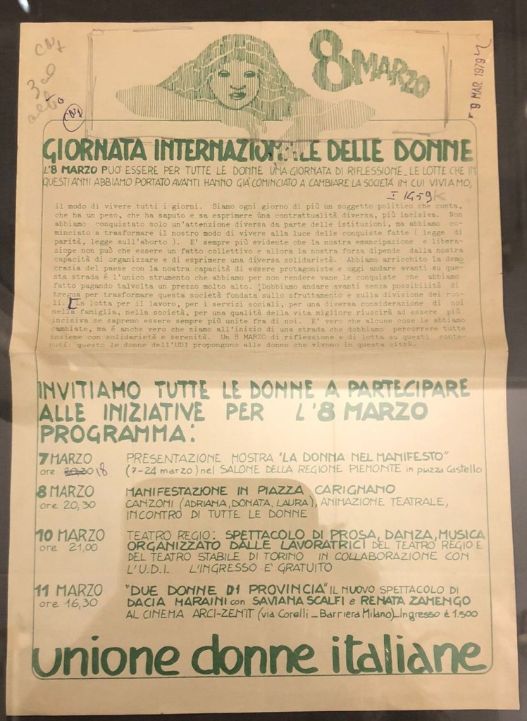 Il cuore pulsante della mostra “Torino e le donne” risiede nella prima sala a destra dell’entrata, dove è possibile ammirare la storia del capoluogo piemontese, tutta al femminile. Il racconto è reso possibile grazie a fotografie, manifesti autentici, poesie, manufatti, documenti video e pannelli esplicativi.