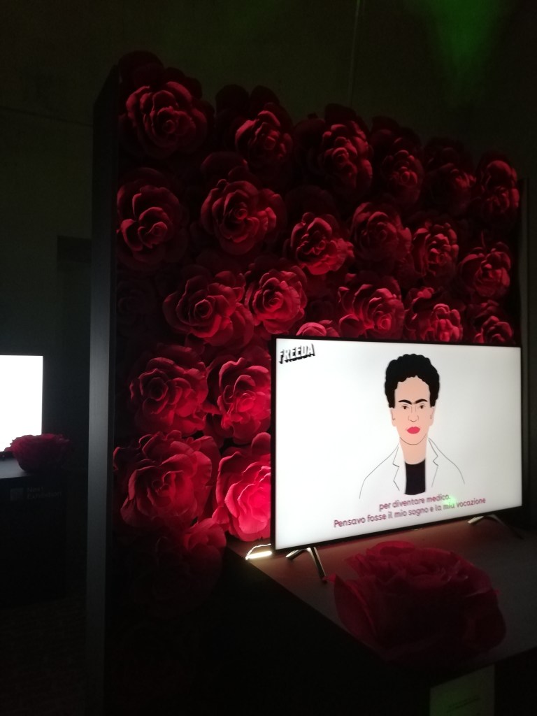 Un televisore incastrato in un muro di rose vi accoglierà nella prima sala e vi spiegherà, con un video animato realizzato da Freeda, pagina social il cui nome ricorda quello di Frida Kahlo, la sua vita ma soprattutto il tragico e tristemente noto incidente del 1925, che questa vita l’ha cambiata per sempre. Proseguendo il percorso, si accede all’ingresso della Casa Azul, dimora in cui hanno vissuto la pittrice e suo marito Diego Rivera, oggi sede del museo Frida Kahlo. Si passa poi alla seconda sala: una vera e propria immersione nel mondo di Frida attraverso riproduzioni degli ambienti, come il suo studio e il letto a baldacchino nel quale dipingeva i suoi famosi autoritratti nel periodo in cui era rimasta immobilizzata, a causa del già citato incidente. Per completare il tutto, sono state esposte anche riproduzioni dei suoi abiti e dei suoi monili, rappresentanti del suo stile iconico, colorato e ispirato al suo amato Messico.