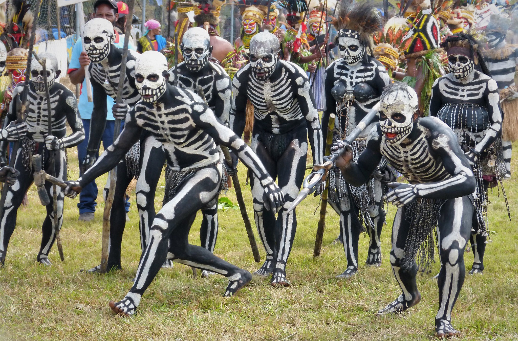 Tuttavia, vi sono alcune occasioni speciali durante le quali l’appartenenza ad un determinato clan passa in secondo piano e lascia il posto all’appartenenza alla tribù, un gruppo più ampio. Uno di questi momenti è il Festival della montagna di Hagen, durante il quale i membri della tribù si dipingono il corpo, disegnando linee e contorni in modo da assomigliare a scheletri per poi intrattenersi in una danza.