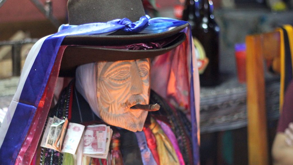 A Santiago Atitlàn, attualmente, ci sono tre correnti religiose maggioritarie: gli evangelici, i cattolici e coloro che sono rimasti fedeli alla Cosmovisione ancestrale, chiamati tradizionalisti. Vuole la leggenda che il Fuoco parlò al villaggio di Tz’ikin Kaay (attuale Santiago Atitlàn), mettendo in guardia le popolazioni indigene dal grande pericolo che si stava profilando all’orizzonte: l’arrivo degli spagnoli al villaggio. Le guide spirituali, gli Ajq’ij’, decisero perciò di costruire un simulacro per uno spirito dei regni inferiori, in modo che proteggesse il villaggio e gli abitanti. Si avventurarono quindi nella foresta, chiedendo agli alberi di donare il proprio legno, con il quale fu costruito un feticcio. Canalizzarono quindi le energie dei nahuales (spiriti) nell’idolo, fino a che divenne un umano. A questo punto la leggenda si biforca: forse perché spaventati dal grande potere del dio, o forse perché il suo vorace appetito sessuale lo aveva portato ad infastidire tutte le donne del villaggio, gli Ajq’ij’ decisero di farlo a pezzi. Successivamente l’idolo fu ricostruito attraverso un intreccio di corde: nacque così il Maximon, colui che è sorretto da corde.