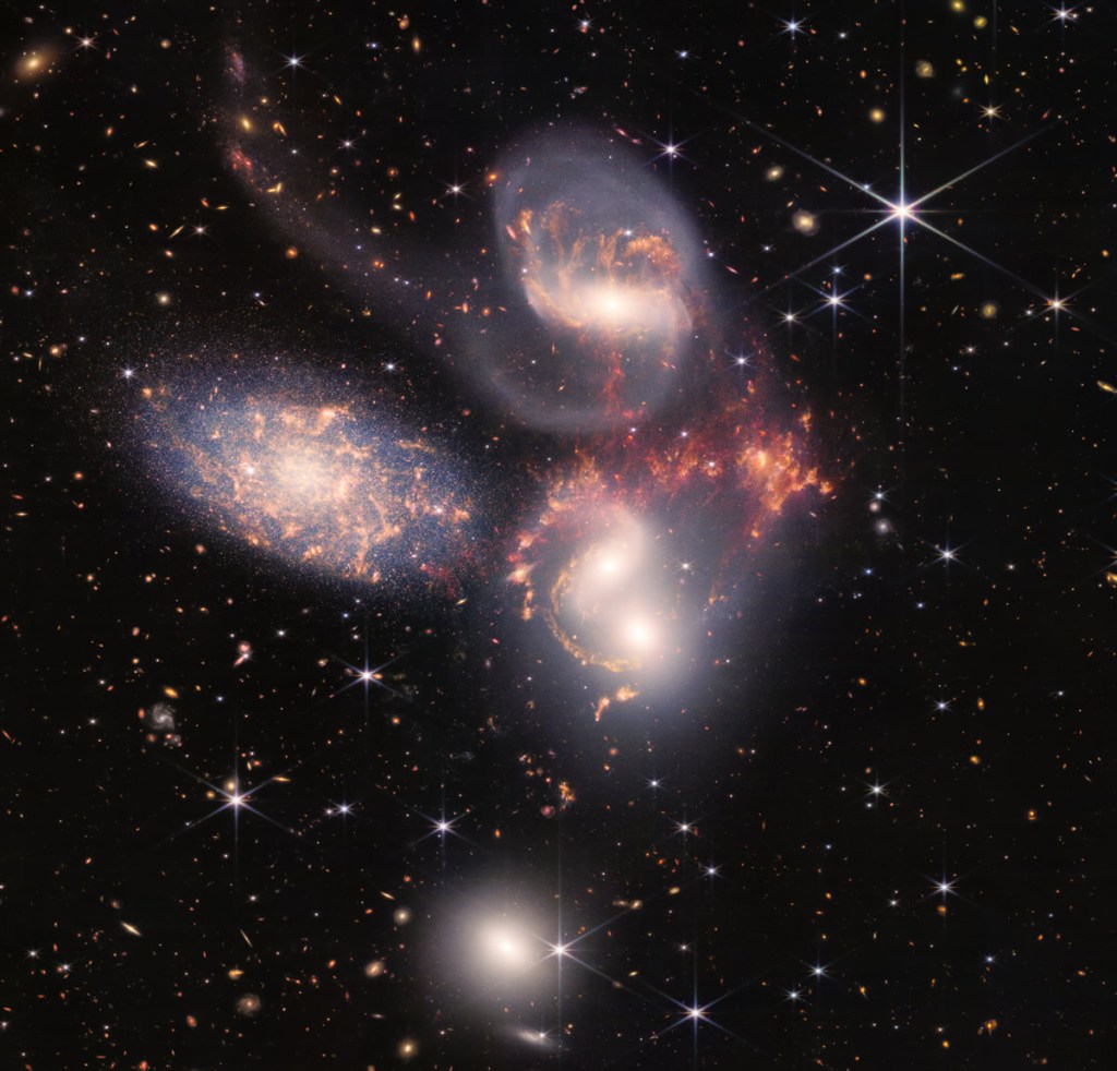 L’immagine più grande realizzata, nonché una delle più difficili da costruire (è il risultato di circa 1000 immagini separate) del JWST: è un raggruppamento di cinque galassie, arricchito nello sfondo da molte stelle mai viste prima. Grazie alle nuove informazioni date da Telescopio, si potrà approfondire il ruolo delle interazioni tra galassie nell’evoluzione dei primi tempi dell’universo.