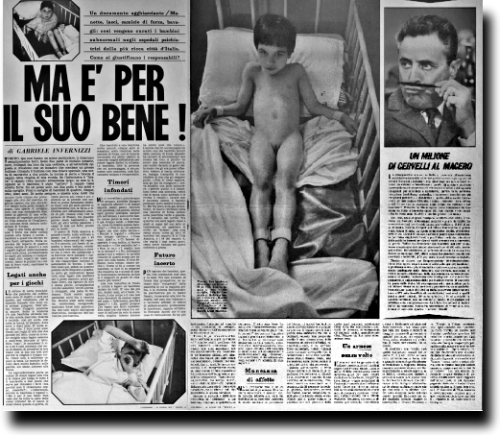Negli anni ’70, un coraggioso fotografo, Mauro Vallinotto, si introduce in Villa Azzurra. Uno dei suoi scatti verrà pubblicato su L’Espresso, assieme a un articolo che denuncia le brutalità del manicomio per bambini. La fotografia raffigura una bambina completamente nuda legata a un letto in una posizione come di crocifissione laica, un’immagine dal denso significato e che suscitò grosso scalpore. Così racconta Vallinotto: “Io ero entrato dalla porta principale della palazzina B, ero salito al primo piano senza che nessuno mi intercettasse e avevo scattato una cinquantina di fotografie. Questa foto fu coraggiosamente pubblicata dal giornale nel 1970, in un articolo di Gabriele Invernizzi. Dopo due ore dall’uscita del giornale, già c’erano i carabinieri a Villa Azzurra, c’era la magistratura che si era interessata e di lì è partito lo smantellamento progressivo del reparto”.