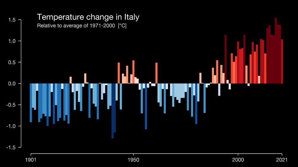 In generale le zone più colpite in Italia saranno quelle alpine, mentre i cambiamenti si faranno sentire di più nel periodo estivo: entro il 2050 le temperature medie potrebbero aumentare di 2° rispetto a quelle registrate nel trentennio 1081-2011, di 5° entro il 2100.