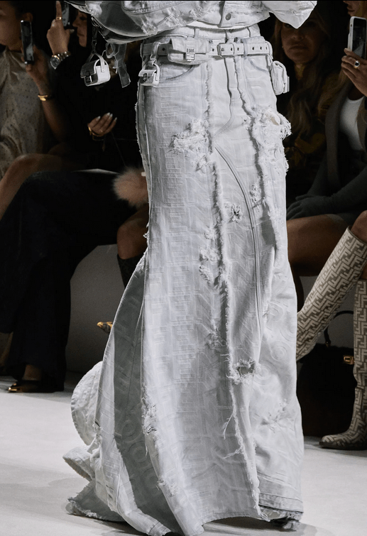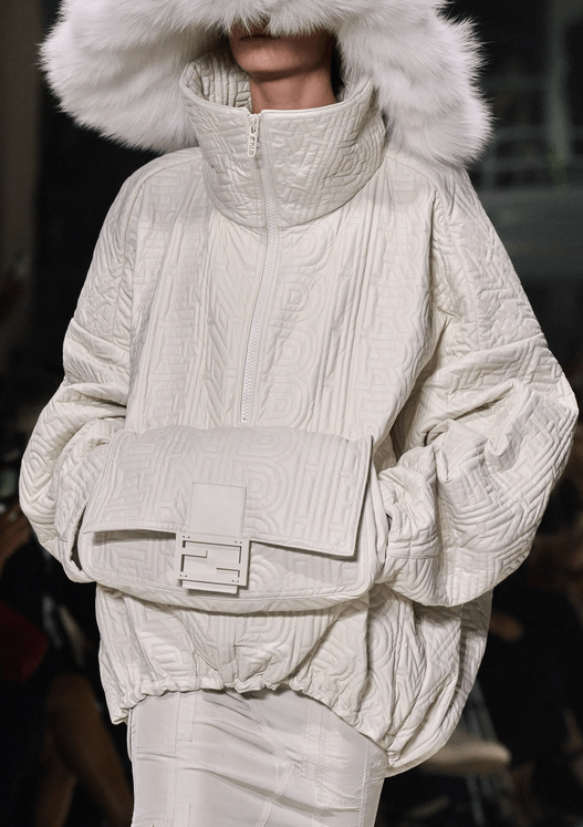 Il look della sfilata che è rimasto nella mente di ognuno di noi è sicuramente il total look azzurro Tiffany indossato da Bella Hadid e composto da tuta con scollo vertiginoso, copricapo, bracciale e collana con ciondolo a forma di Baguette, oltre che una Baguette vera e propria indossata a mano anziché a spalla. Le collaborazioni poi non finiscono qui, infatti, la collezione è stata disegnata anche con Marc Jacobs. Il suo contributo è evidente, però non è reso manifesto da loghi all over che si intrecciano fra loro, come abbiamo visto in altre partnership come Fendace (come dice il nome, è la collab tra Fendi e Versace), Balenciaga e Gucci o Adidas e Gucci, per fare alcuni esempi. Infatti, il logo che figura sui capi non è quello dello stilista Newyorchese, ma quello di Fendi Roma, sotto forma di lettere intarsiate su tute e giacche, principalmente.