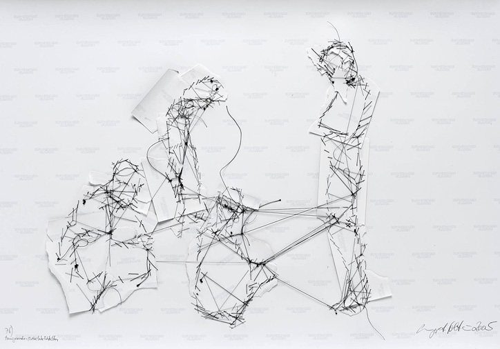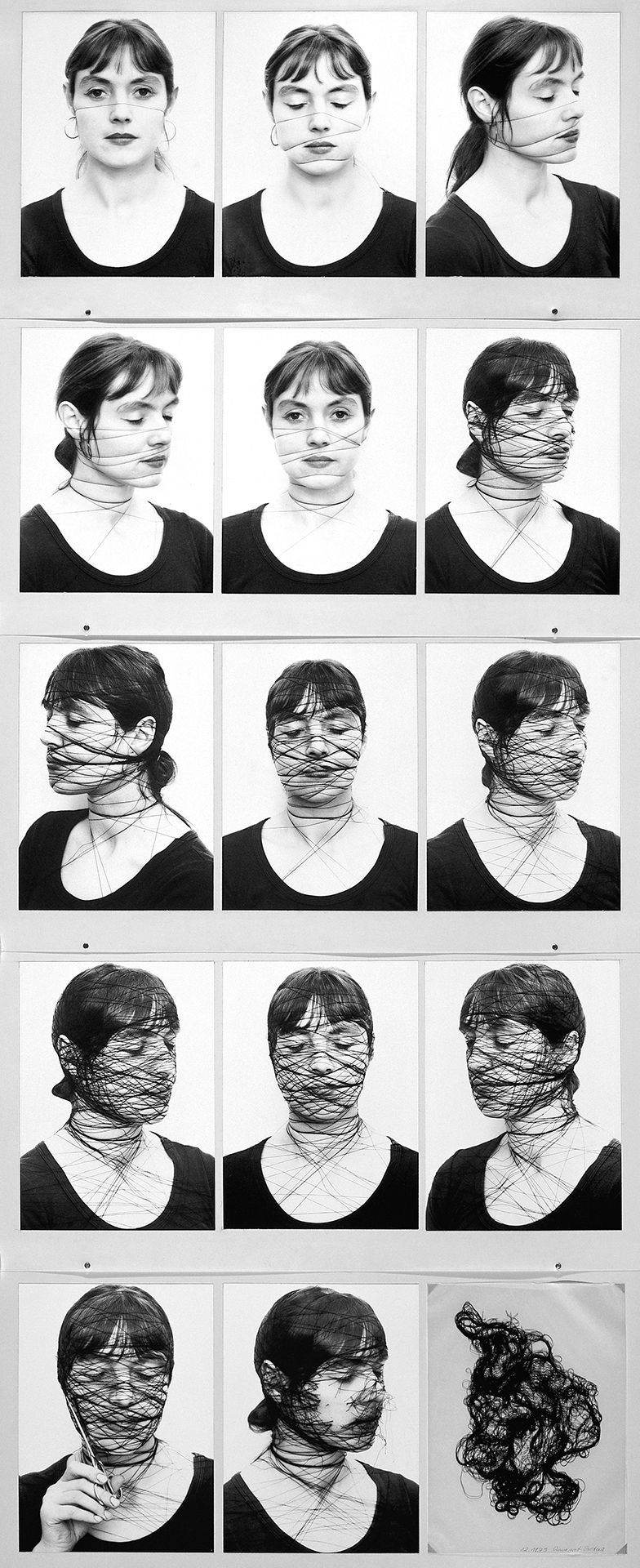 […] As an example, I then took myself as a model in 1975, because I can go furthest with myself. Instead of carving into the metal plate, I now took a black thread and “marked” my own face with it until I could no longer see, speak or hear, until I was incommunicado, so to speak. I laced the thread so far around my face up to the point of deformation, penetrates into the skin up to the pain limit. The details of my face seem to have disappeared and frozen, it resembles an act of mummification. I reach for the scissors and free myself. The black thread remains as a document and forms the last sheet to the 14-part photo sequence. […] The black thread is ambivalent for me, first of all it is my working material, but then also a traditional thread that women use for sewing as well as the healing thread that a surgeon uses during operations.