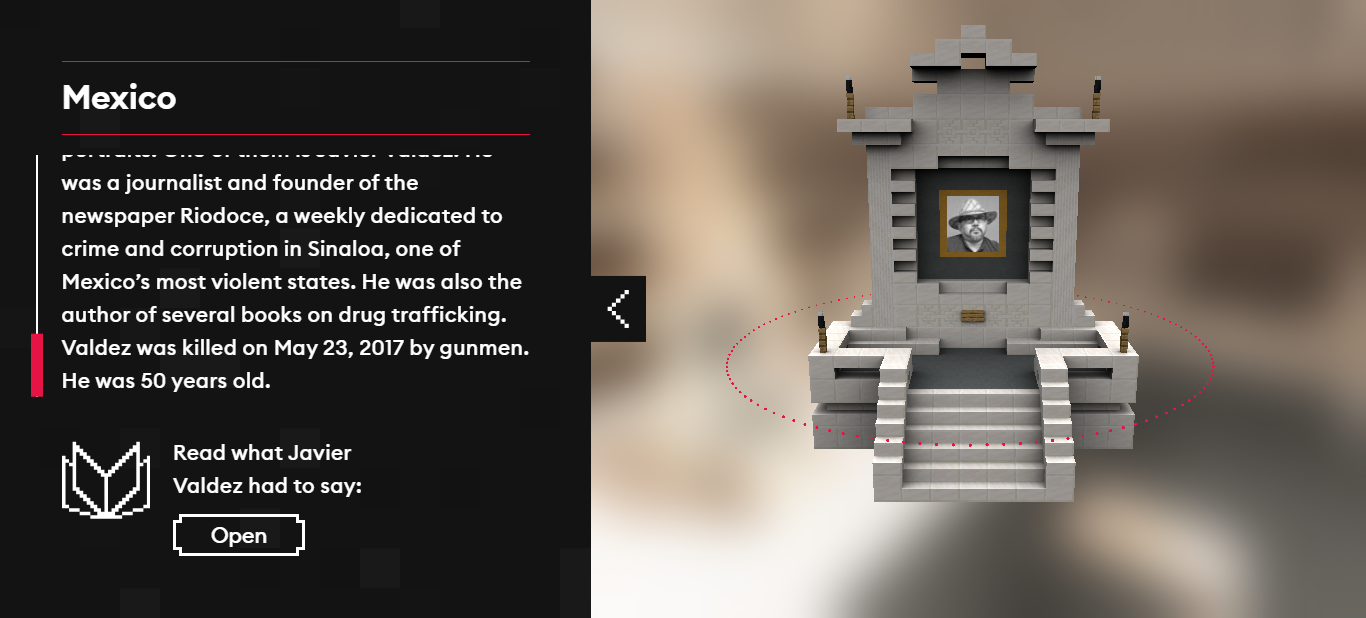 A crearla è stata Reporter Sans Frontièrs, un’organizzazione non governativa e no-profit, con lo stato di consulente delle Nazioni Unite, nata nel 1985 col grande obbiettivo di tutelare la libertà di stampa e informazione: infatti le sue due grandi attività sono monitorare la censura su Internet e fornire assistenza materiale, economica e psicologica ai giornalisti assegnati a zone pericolose.1 Oltre a questa attività in prima linea, RSF redige annualmente report e inchieste che informino costantemente sulla situazione attuale del giornalismo nei vari paesi del mondo. Alcuni esempi sono l’Indice mondiale della Libertà di Stampa, manuali per giornalisti e blogger in zone di guerra, o l’Indice dei predatori della Libertà di Stampa (un elenco di soggetti considerati come peggiori violatori della libertà di informazione). Al suo interno, la struttura dell’Uncensored Library è tutt’altro che banale, ma studiata nei minimi dettagli, anche simbolici. Entrando all’interno troviamo cinque sezioni principali dedicate ad un determinato Paese e a un giornalista che qui è stato censurato: Egitto, Messico, Russia, Arabia Saudita e Vietnam. Negli ultimi tempi si sta cercando di ampliarla sempre di più, creando nuove sezioni per altri Stati, come è stato fatto con una nuova area dedicata all’impatto della pandemia di Covid-19 sull’informazione in vari Paesi. Entrando in ogni sezione si rimane subito colpiti da alcuni aspetti: primo fra tutti la presenza di alcune foto ritraenti delle persone. Non degli avatar di Minecraft composte di blocchi, ma persone in carne ed ossa, esposte in dei quadri dall’aspetto commemorativo. E subito è chiaro il motivo: la maggior parte di quei giornalisti ritratti è morto per perseguire il diritto d’informazione e di libera espressione. E quello costruito per loro non è solo una pagina online, ma una sorta di mausoleo virtuale altrimenti impossibile da realizzare.