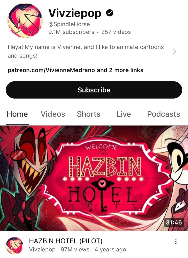 Una delle particolarità della serie è il fatto che l’episodio pilota, pubblicato su YouTube il 18 ottobre 2019, è stato prodotto da animatori freelance e finanziato in gran parte dai follower della Medrano, allora conosciuta con l’username VivziePop, tramite Patreon. Il video è arrivato a ben 32 milioni di visualizzazioni in sei mesi, seguito, soltanto un mese dopo, dall’episodio pilota di uno spin-off di Hazbin Hotel: Helluva Boss. Quest’ultimo diventa nel 2020 una serie vera e propria, composta da due stagioni, rispettivamente di 8 episodi la prima e 12 la seconda (ancora in corso).