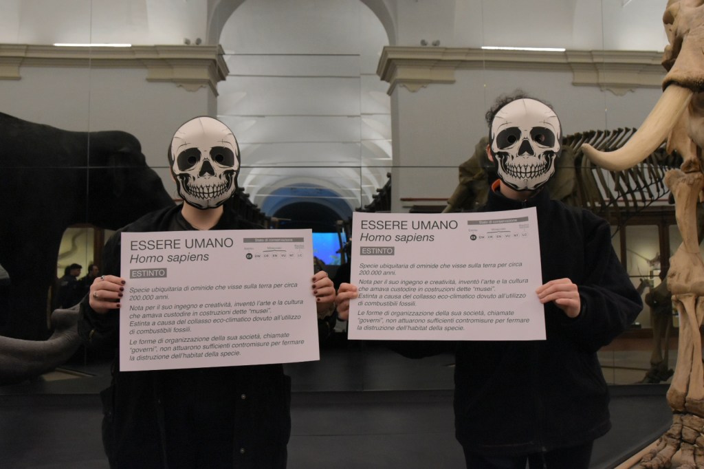 L’idea di fare qualcosa presso questa istituzione era nell’aria da tempo. Abbiamo dovuto aspettare la sua riapertura. È un luogo fortemente simbolico, anche il gruppo di Extinction Rebellion UK, dove nasce il movimento, fece un’azione al Science Museum di Londra. È un tipo di museo, quello naturale, che porta con sé temi strettamente legati alla crisi climatica e a quella ecologica. Viene spontaneo chiedersi quand’è che le specie che ci circondano andranno a finire nelle aree dei musei dedicate alle specie estinte. Chiaramente, la specie umana non è in via di estinzione, ma lo è la società umana per come la conosciamo, la nostra idea di stato di diritto, la nostra idea di benessere — che è legata ai servizi ecosistemici che stiamo minacciando — la tenuta del tessuto sociale. Secondo noi, il museo in quanto istituzione scientifica e divulgativa può giocare una parte importante, insieme ai media e alle fonti di informazione.