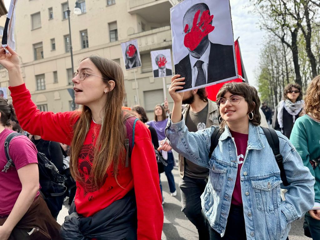 Insieme agli studenti delle superiori, a Torino hanno partecipato in solidarietà alla manifestazione anche studenti universitari e giovani lavoratori. «Il governo che vota riforma Valditara è lo stesso governo che si rende complice del genocidio palestinese, e che reprime con la violenza il dissenso di coloro che si oppongono a questo massacro», viene spiegato da uno di questi durante un intervento. “Soldi alla scuola, non alla guerra” è uno degli slogan che si leggono sui cartelli dei ragazzi.