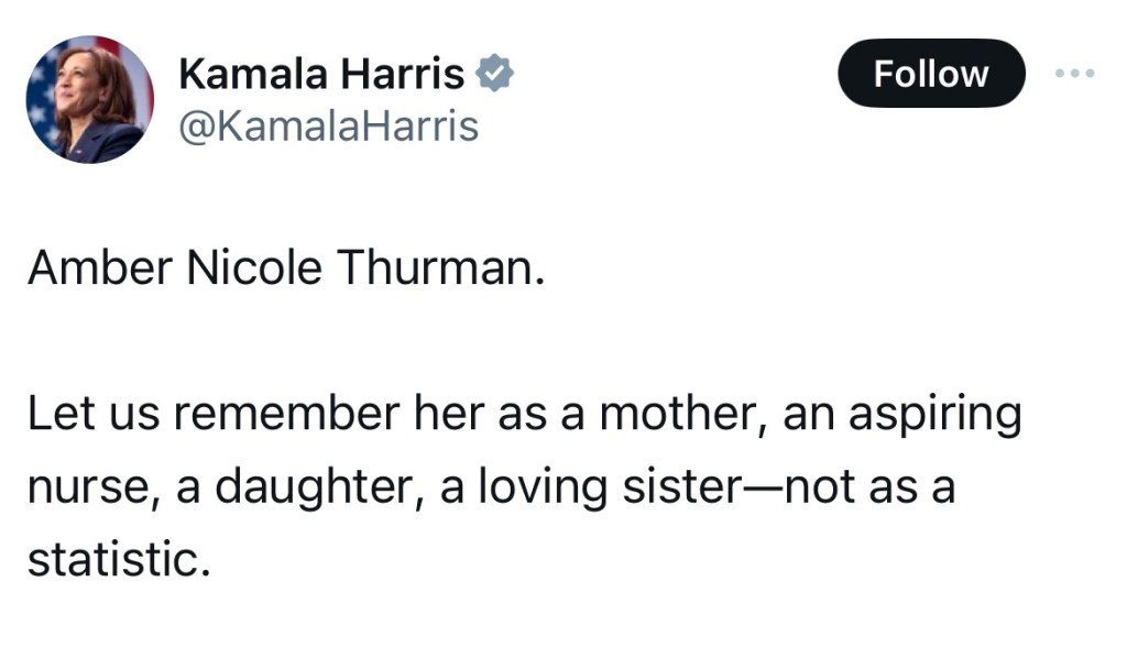 La candidata alla presidenza Kamala Harris è intervenuta a riguardo al Cobb Energy Performing Arts Center in Atlanta. Sottolineando come la storia di Amber sia un esempio lampante di come il ribaltamento di Roe v. Wade, da parte della Corte Suprema, abbai un impatto pericolosissimo sulle vite delle donne americane.