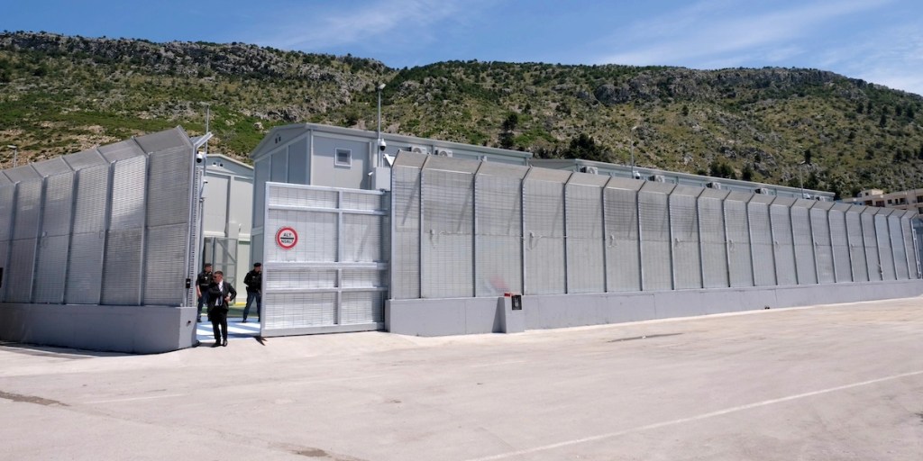 Il nuovo centro migranti in Albania. Crediti immagine: AP Photo/Vlasov Sulaj https://www.ilpost.it/2024/07/18/confusione-centri-migranti-albania/