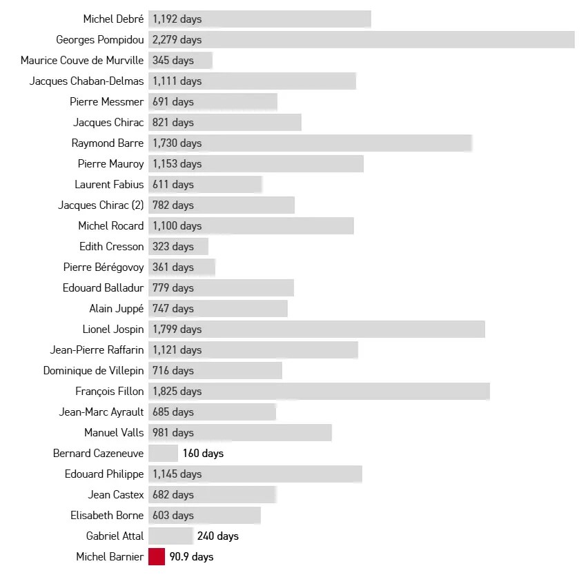 Durato 90 giorni, il governo Barnier è il più breve della storia di Francia. Cambiare tre primi ministri nel giro di un anno è una situazione che sa quasi di casa per gli italiani, ma di certo non per i francesi: basti pensare che l’ultimo governo che ha ottenuto la sfiducia del Parlamento è stata l’amministrazione Pompidou del 1962.