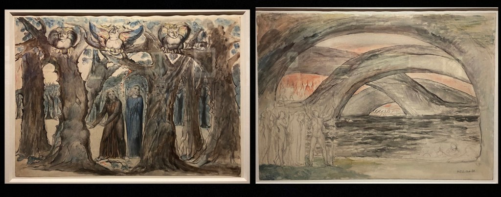 Nel 1824 a Blake fu affidato l’incarico di illustrare il capolavoro dantesco, l’Inferno, con il proposito di ricavare una serie di incisioni, rimaste però incompiute a causa della morte sopraggiunta dell’artista solamente tre anni dopo (oggigiorno ci rimangono un centinaio di acquarelli in diversi stati di elaborazione; da questi sono state realizzate sette incisioni).