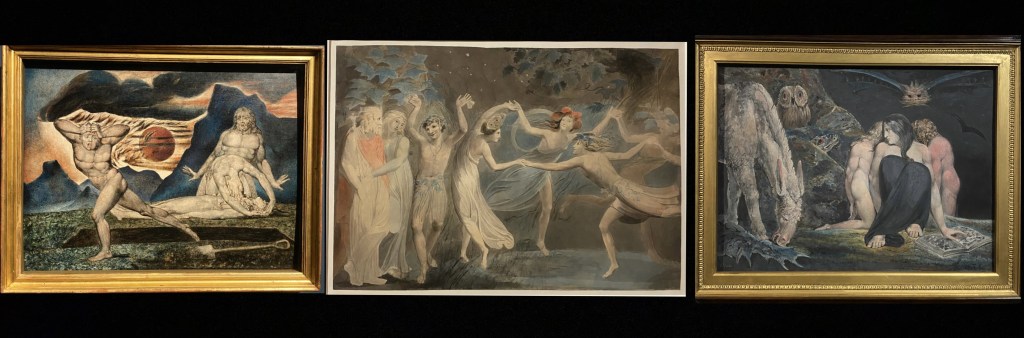 Blake prediligeva soggetti vicini all’inquietante, corpi contorti e conturbanti, la raffigurazione del mostruoso e del tormento, del soprannaturale e del fantastico declinato al regno delle fate e degli spiriti.