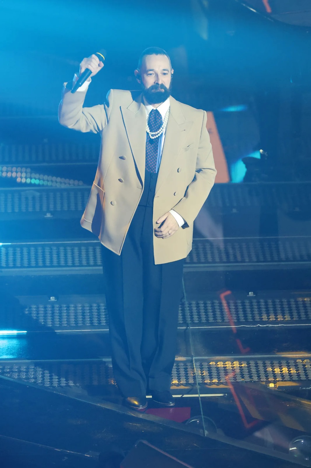 Per questa edizione, l’unico a non averne assunto uno è stato Lucio Corsi, rivelazione di questo Festival, quindi cominciamo da lui. La sua estetica è del tutto coerente con la canzone e con il personaggio, che ha scelto di portare con orgoglio le proprie fragilità. La giacca indossata la prima sera è stata realizzata a mano e l’artista, per arrangiarsi, ha imbottito le spalline di sacchetti di patatine; la seconda sera ha indossato invece una t-shirt con il gatto Silvestro e ha anche dimostrato grande eleganza nella scelta dell’abito bianco per la serata delle cover. Lucio, quello che ha dichiarato di essere indifferente alla moda, ha portato la vera moda sul palco di Sanremo, quella che nasce da un’esigenza di espressione di sé e del proprio mondo.