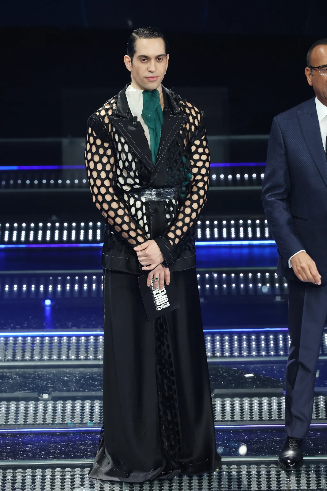 Mahmood, co-conduttore per la quarta serata, è abituato a outfit originali e d’impatto. Come dimenticarsi le sue gonne indossate nell’anno in cui ha cantato con Blanco, i pantaloni oro perfetti per la sua Tuta gold dell’anno scorso, quando ha stupito il pubblico con la sua apparizione sul green carpet con un corsetto bordeaux di Maison Margiela con la direzione di John Galliano, stilista unico e visionario. Per questa edizione l’artista si è esibito sul palco con un medley in cui ha dimostrato che le sue abilità non si fermano all’ambito sonoro, ma sfociano anche nella danza contemporanea. L’esibizione è stata accompagnata da un corpo di ballo e da un outfit da vera star: ampi pantaloni rossi costellati da 150 mila brillanti Swarovski. L’ultimo abito della serata è da vero modaiolo: un completo di Maison Margiela con imbastitura in vista e foulard bianco e verde, per un tocco di colore.
