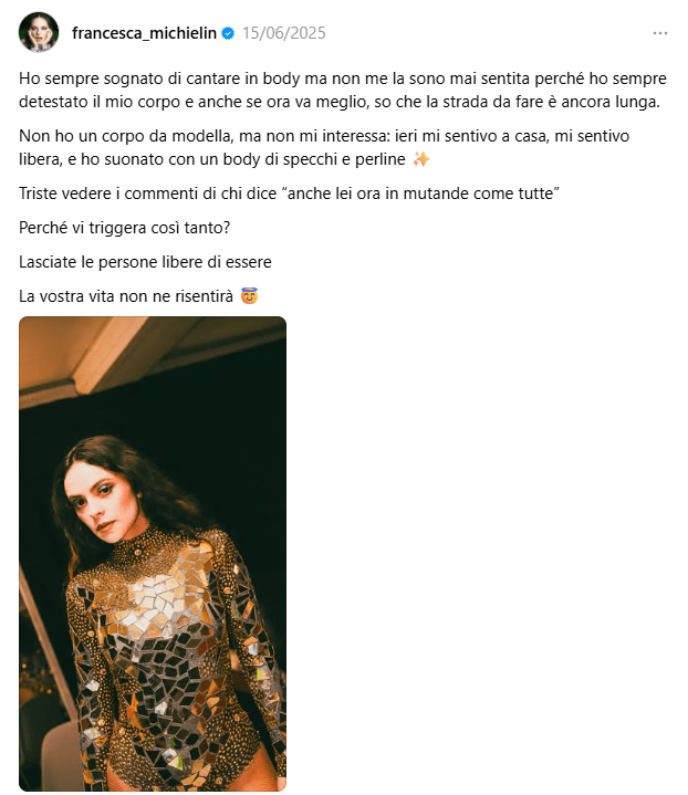 Ed è ironico come, a distanza di pochi mesi, Francesca Michielin sia stata travolta nuovamente da critiche e insulti, ma questa volta a causa di un “eccesso” di femminilità. Almeno, stando a quanto stabilito dagli haters, che non hanno gradito il body dorato e luccicante con cui si è esibita durante una tappa del suo ultimo tour. Qualcuno ha perfino messo in discussione la sua competenza come musicista. La cantante ha risposto a tutto questo in grande stile, trasformando gli insulti in un messaggio di libertà: “Lasciate le persone libere di essere. La vostra vita non ne risentirà”, ha scritto sul suo profilo Threads.