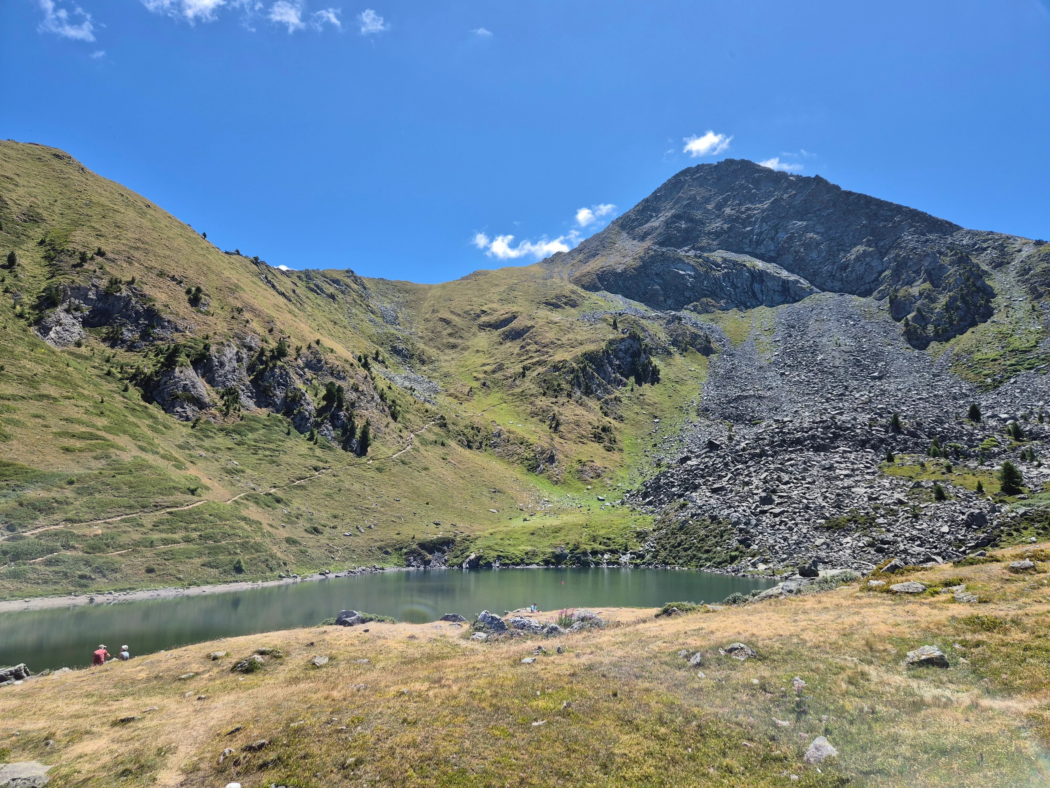 After the pine forest bit, you climb over the ski slope, and then some alpine grass with a view of some of the biggest glaciers in Europe (still there when you go, hopefully). Then, you arrive at the lake Chamolé. A great place to have lunch, I must say. It’s quite a popular location — plus, there is an open funicular that takes you back just 5 minutes away from the lake for €14 one way (which is neither cheap nor hiking, still, it makes the lake an incredibly accessible spot for a picnic without the hassle). Soon after starting your descent, you’ll find bathrooms with drinkable water as well.