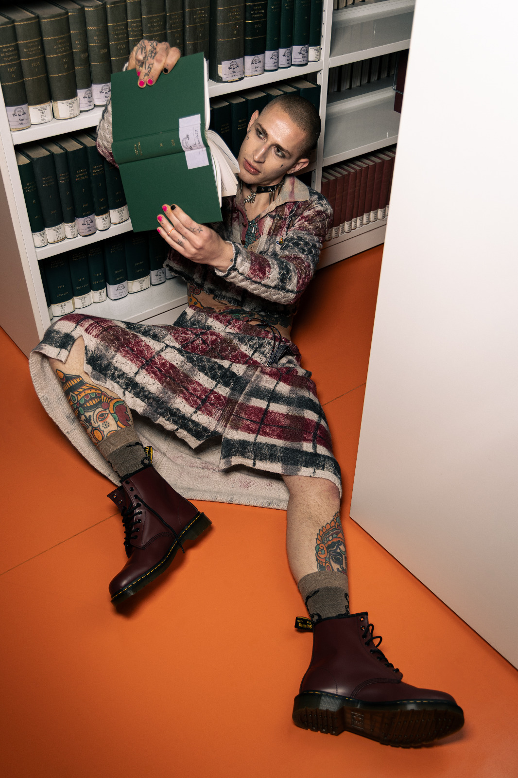 Foto: Gabriele Nicol. Makeup: Stella Grossu. Maglioncino, gonna e calze: Vivienne Westwood, gioielli: stylists’ own, anfibi: Dr. Martens.