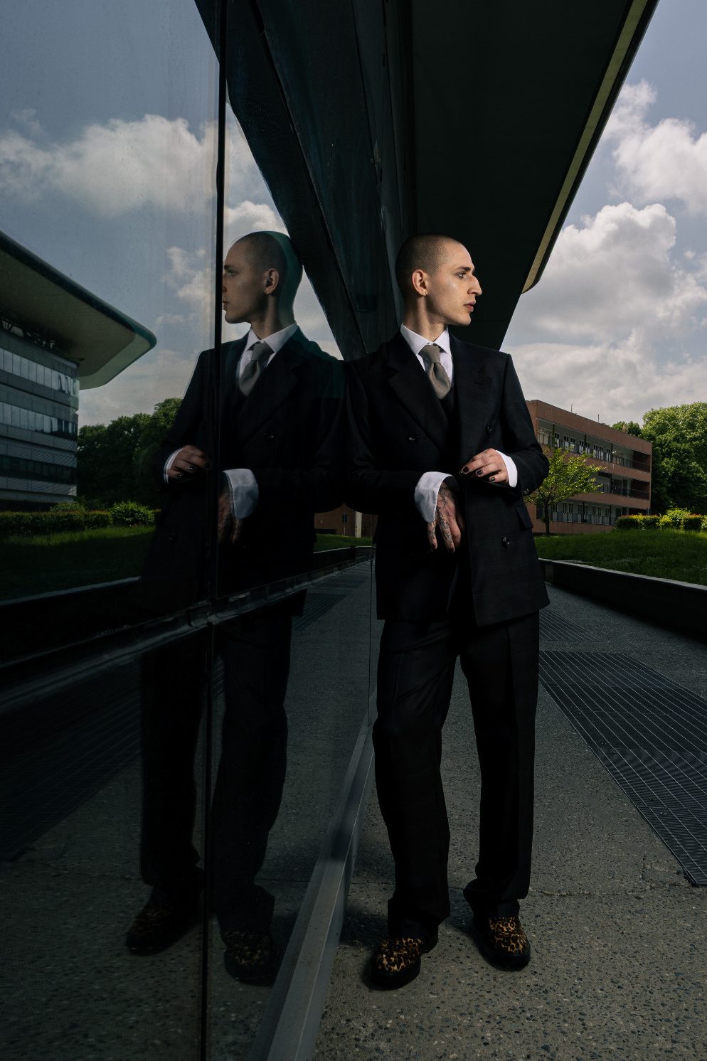 L’intenso blu del completo Brioni e il grigio antracite di quello di Armani rappresentano il punto culminante di questo viaggio. Ormai gli elementi maschili predominano, il trench Tommy Hilfiger e la cravatta Brioni possono sembrare segnali di resa, eppure lo smalto c’è ancora, così come un notevole azzardo, rispetto alle convenzioni: le scarpe animalier. C’è ancora sfida, anche nel suo sguardo. Il ragazzo non si è dimenticato chi è.