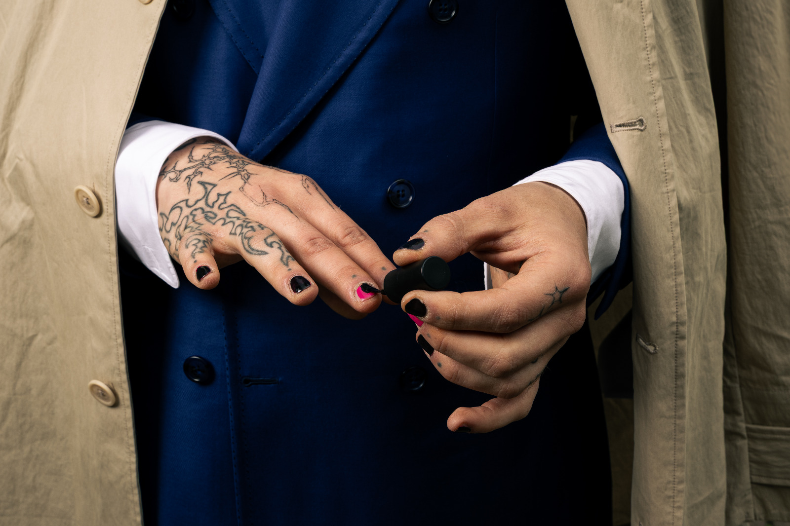 Scompaiono le ultime note di rosa, ma le unghie rimangono laccate. Anche se si adegua, il ragazzo punk continua a rimanere fedele al proprio modo di essere. Dei gemelli ai polsini non gli importa nulla, così come di nascondere i tatuaggi. Si è integrato, ma a modo suo. Ha trovato un modo di esprimersi comunque.