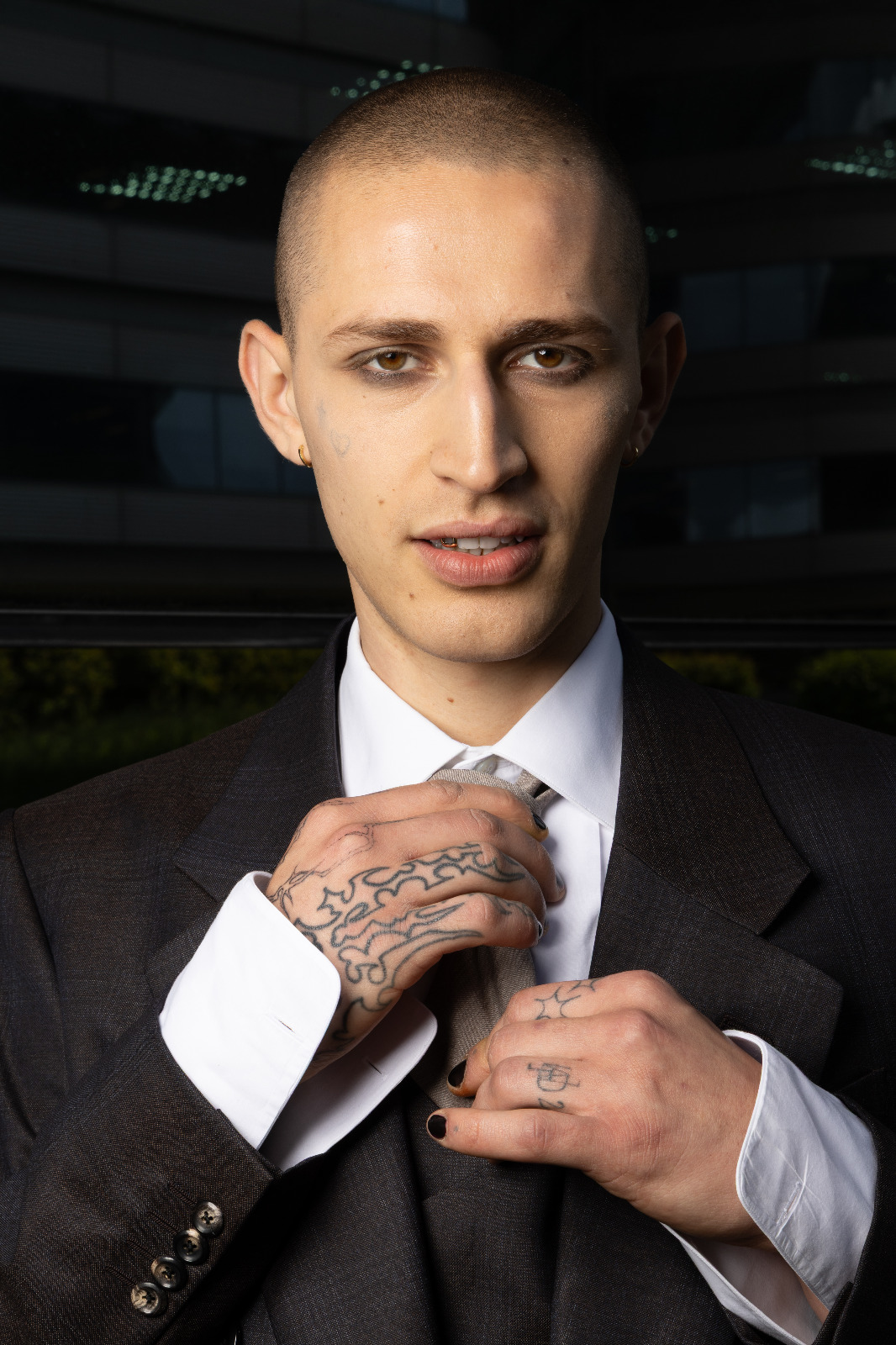 Nella prima foto possiamo apprezzare l’allure androgina dell’outfit, con questa texture calda color tartan che sembra quasi antica, in confronto con le forme moderne e destrutturate del completo. La dualità del soggetto è certamente ben rappresentata. Gli anfibi color borgogna e i gioielli tipici del mondo femminile creano un layering sia aggressivo che delicato, mostrando un ragazzo complesso, con un passato difficile che gli rende complicato comunicare col prossimo. L’occhio sottile, reso ancora più allungato dall’eyeliner nel secondo scatto e le labbra arricciate ci parlano di una personalità sfaccettata, multiforme, curiosa.