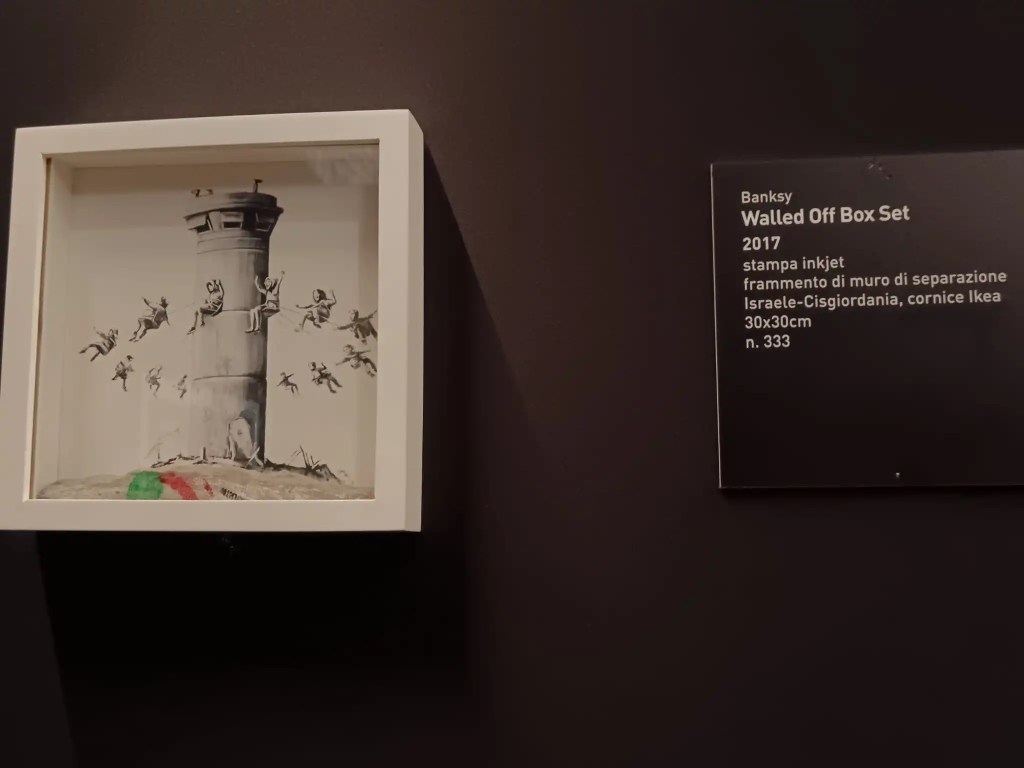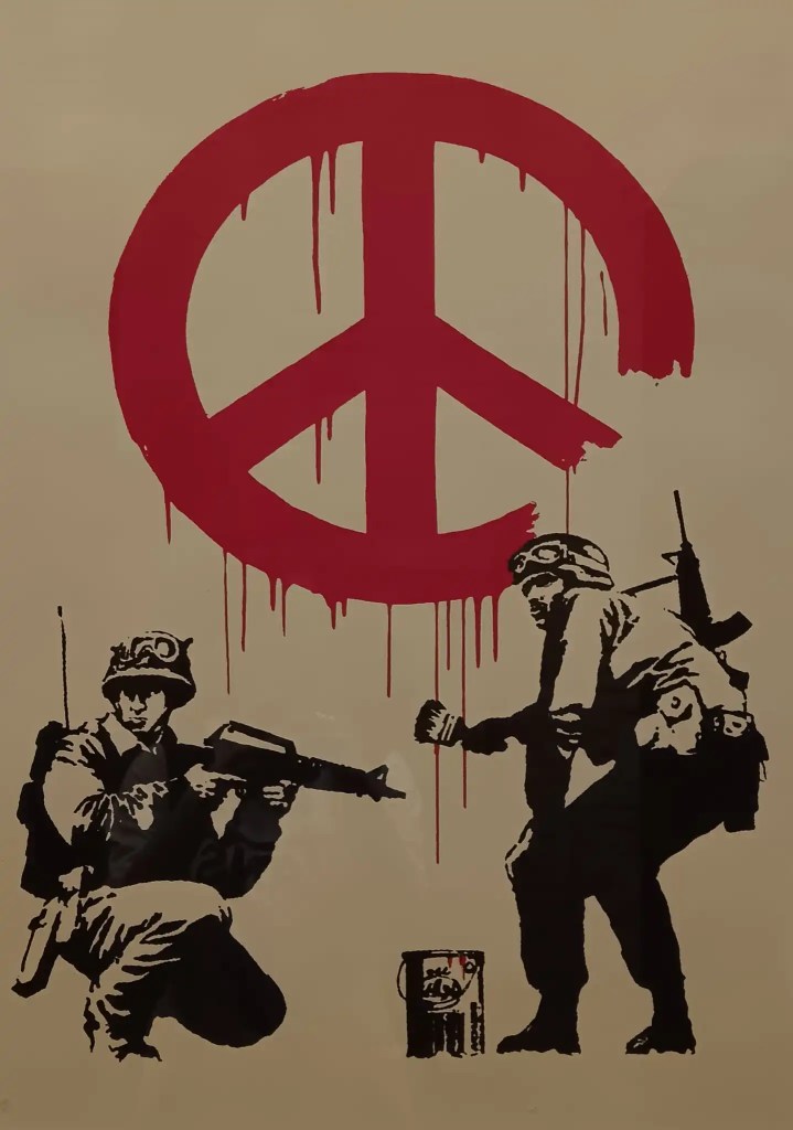 Sempre restando nell’ambito dell’importanza della pace, fino all’11 gennaio alla Rocca Maggiore di Assisi sarà possibile visitare una bellissima mostra di Bansky intitolata appunto Peace on Earth (visitabile anche con il virtual tour). Il nome trae spunto dall’opera di Bansky realizzata su un muro di Betlemme, in cui compare una colomba con un giubbotto antiproiettile che porta un ramo d’ulivo nel becco. Tra le opere più significative si possono anche menzionare Love Is In The Air, dove appare il forte contrasto tra un manifestante violento e il mazzo di fiori (simbolo di pace e amore) che sta lanciando, Walled Off Box Set, creato a partire da un frammento del muro che ancora divide Israele e la Cisgiordania e, infine, CND Soldiers, una rappresentazione dei militari armati di tutto punto che tracciano il simbolo della pace. Quest’ultima immagine, come scritto nella didascalia, intende far riflettere “sull’uso paradossale dei militari adoperati per diffondere «pace e democrazia»”.