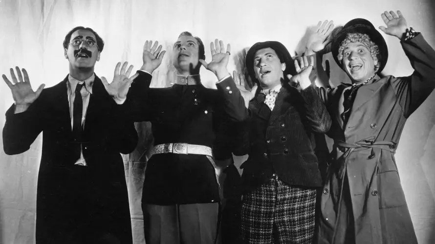Eppure il loro cinema, lungi dall’essere caotico o semplicemente “anarchico”, è un laboratorio collettivo in cui l’esperienza del vaudeville, l’improvvisazione teatrale, il nonsense letterario e il ritmo slapstick si fondono in un linguaggio unico. I film dei Marx non sono film di regista, bensì film dei Marx: opere modellate dalla loro corporeità scenica, dal loro gesto comico e dalla loro irriducibile invenzione verbale, dove le convenzioni narrative non vengono rispettate, ma dilatate, deformate, talvolta apertamente sabotate. È proprio in questo scarto che si costruisce una forma di pensiero critico.
