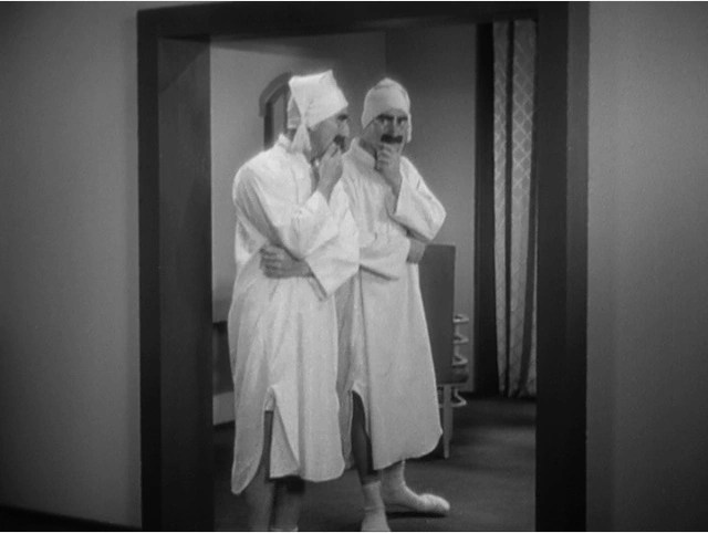 La guerra lampo contiene alcune delle sequenze più celebri della storia del cinema comico. L’ingresso dall’alto di Groucho nella cerimonia d’investitura rovescia subito il cerimoniale politico, trasformando l’autorità in parodia. Le trattative diplomatiche tra Trentino, Chicolini e Pinky mostrano come la politica internazionale possa degenerare in un gioco di fraintendimenti e inganni infantili. La famosa scena dello specchio (Fig.3), esempio perfetto di tecnica mimica ereditata dal cinema muto, riflette una domanda sull’identità e sul doppio, giocando con la capacità del cinema di essere illusione e rivelazione insieme. La sequenza del tatuaggio, infine, è un piccolo capolavoro surrealista: il corpo diventa supporto visivo, la pelle si trasforma in superficie narrativa.