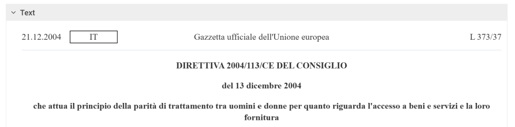 Direttiva 2004/113/CE del Consiglio dell’Unione Europea, Attuazione del principio di parità di trattamento tra uomini e donne nell’accesso a beni e servizi, 13/12/2004, ultima consultazione 10/01/2026, link: https://eur-lex.europa.eu/legal-content/IT/TXT/?uri=celex%3A32004L0113.