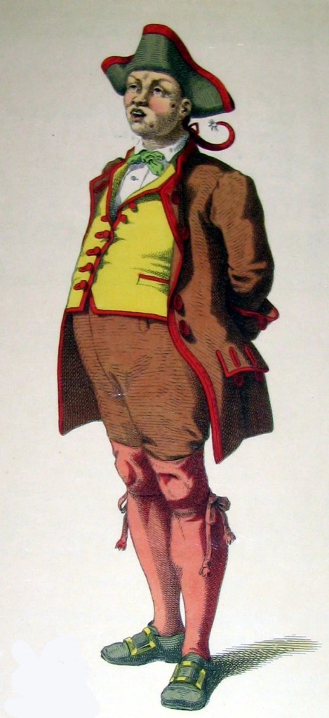 Maschera prettamente piemontese, tipo d’uomo astuto ma onesto, leale, coraggioso, non spavaldo; carattere allegro, tutto cuore per gli amici che sempre lo spillarono per bene. Esso veste alla foggia dei nostri alpigiani del secolo passato: panni di lana greggia color marrone, giacchetta corta, calzoni corti, panciotto e calze rosse, porta un cappelletto a tricorno, codino ed un grosso neo sulla faccia sua sempre sorridente e bonacciona. […] Amatore del buon vino e dell’allegria, esso si presenta in atto di ballare colla pinta in una mano ed il bicchiere ricolmo nell’altra.