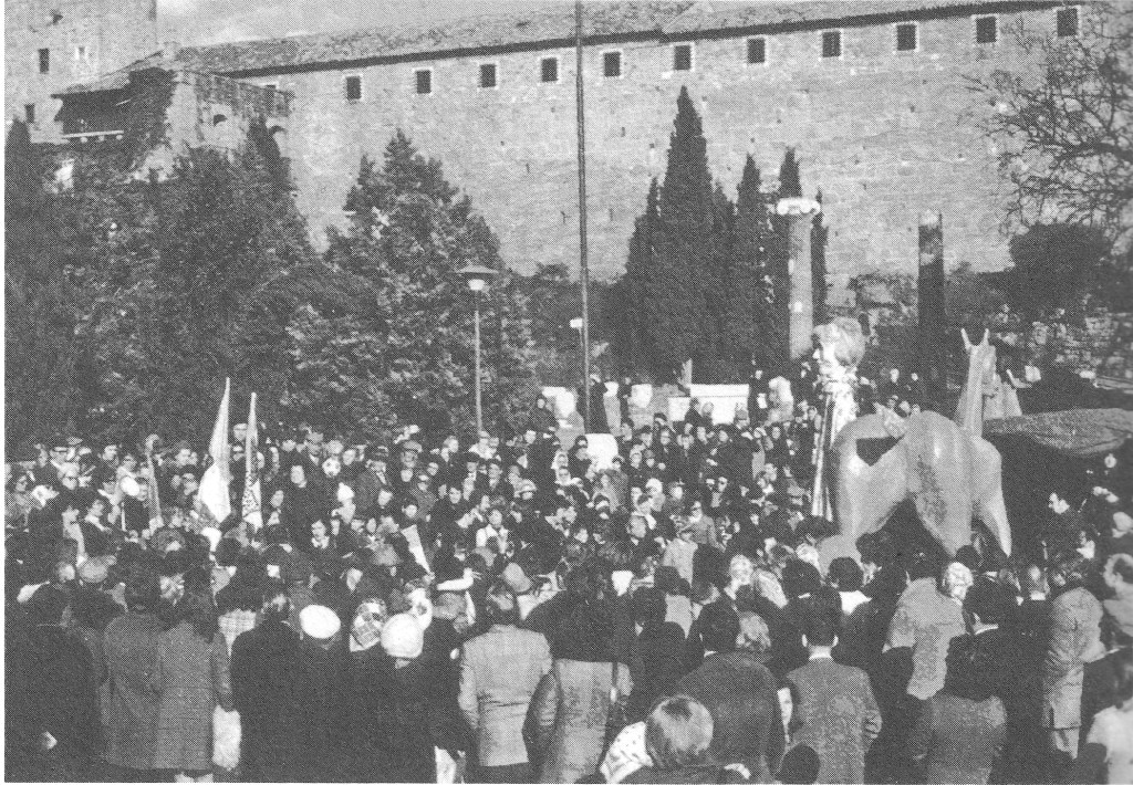 Trieste, 25 febbraio 1973. La statua di Marco Cavallo viene immortalata da moltissime fotografie. Una delle più famose la raffigura circondata da centinaia di persone: si tratta di una festa, di cui Marco Cavallo è il protagonista.