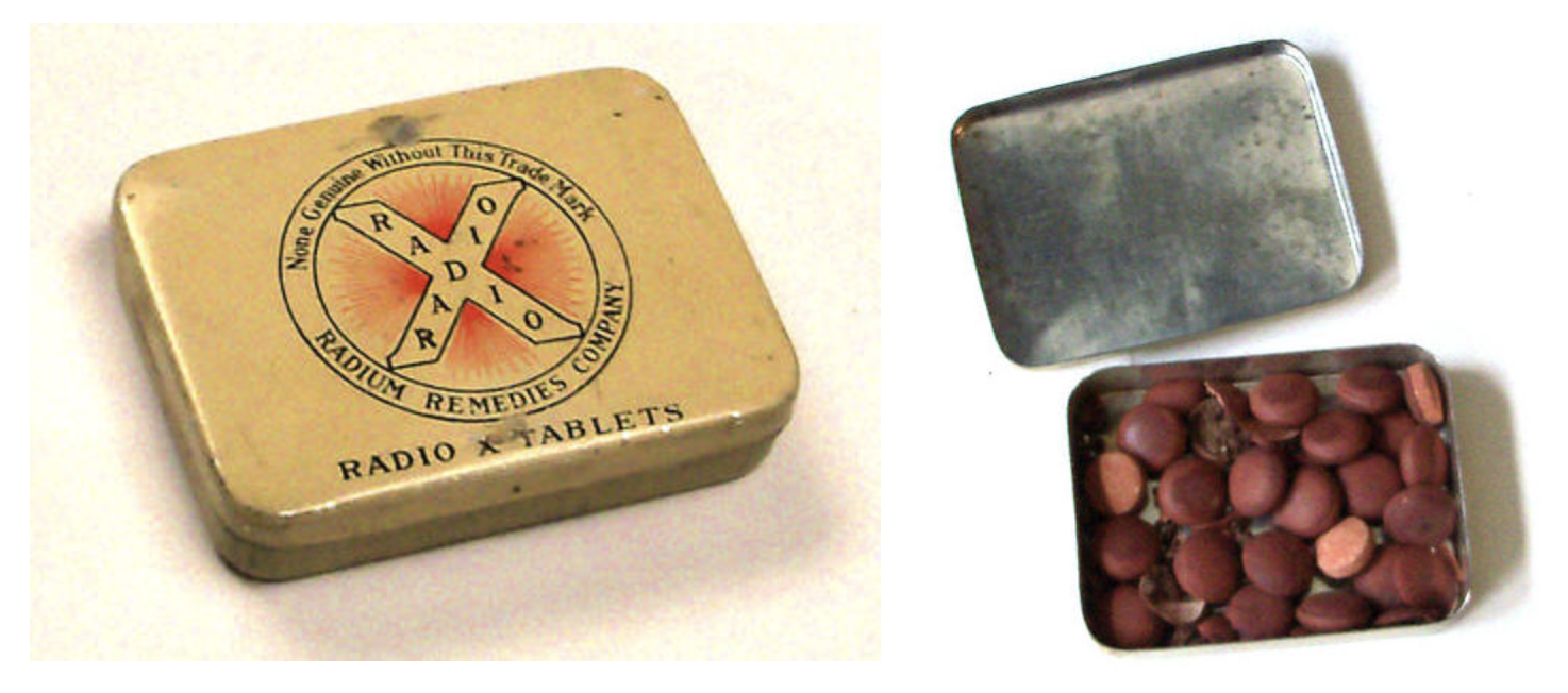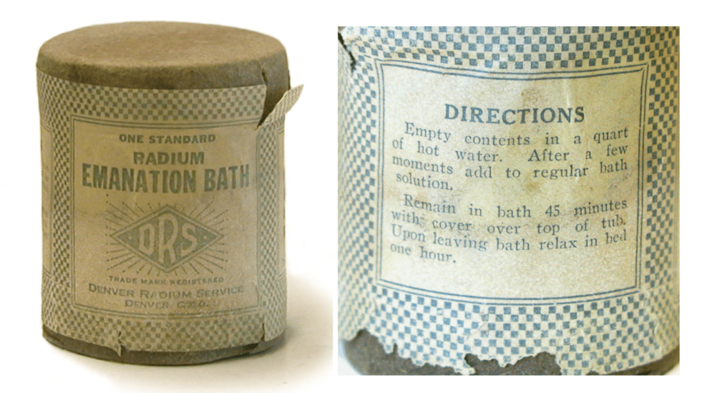 Un esempio di ciò che si poteva trovare tra gli scaffali di un qualsiasi negozio americano nel 1930 è rappresentato dai sali da bagno a base di radio 226 — metallo alcalino altamente radioattivo — che promettevano di curare disturbi nervosi, insonnia, debilitazione generale, artrite e reumatismi.