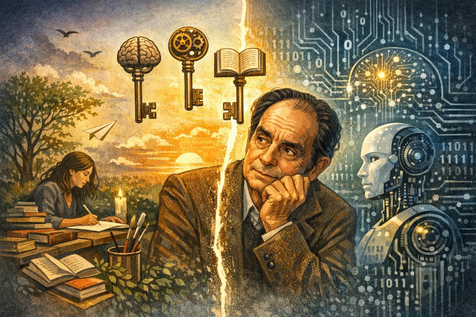 Calvino, letterato in una famiglia di scienziati, ha portato per tutta la vita un amore profondo per le scienze. È da questo doppio sguardo che nasce il suo invito di non contrapporci alle macchine e, allo stesso tempo, di non smettere di essere umani. Quando torniamo a ciò che per noi ha valore e ci concediamo il tempo di pensarci davvero, lì nasce la creatività.